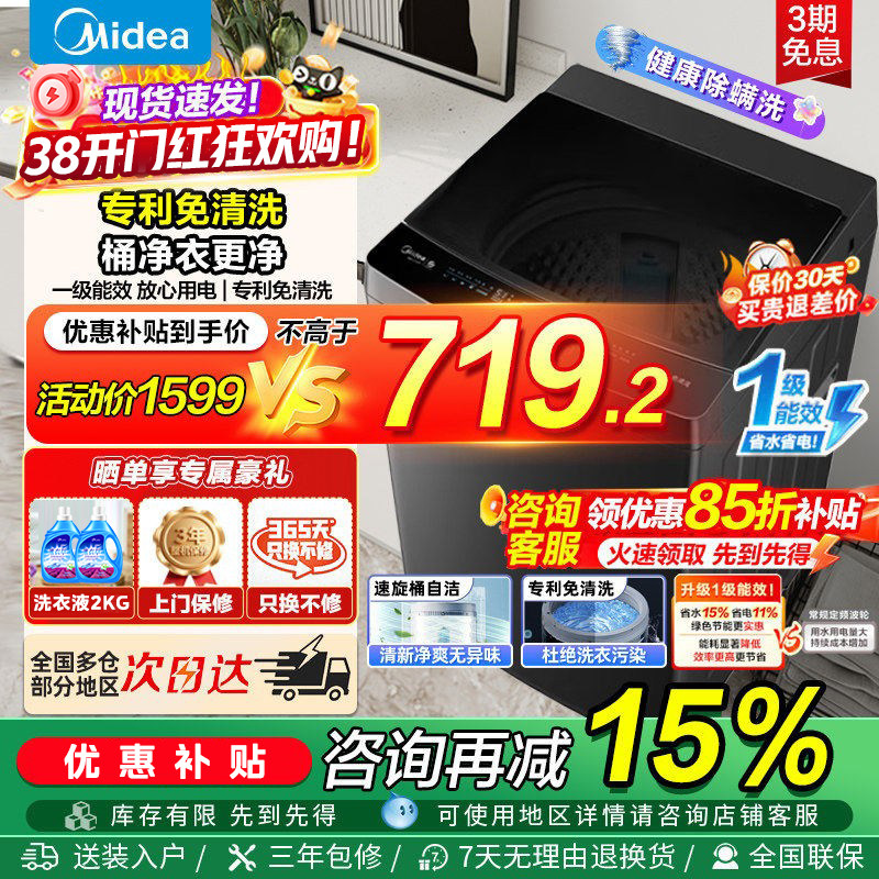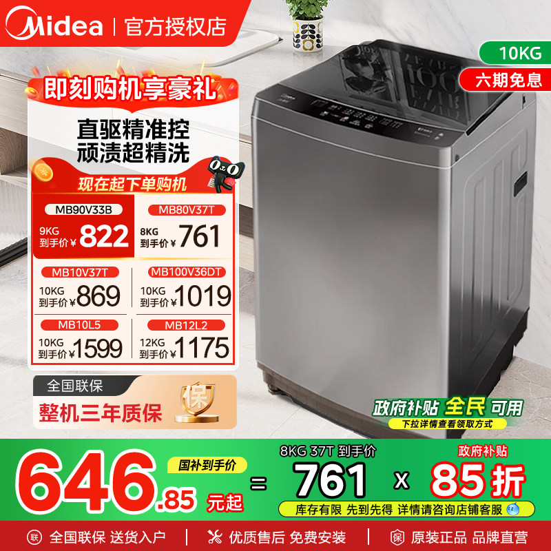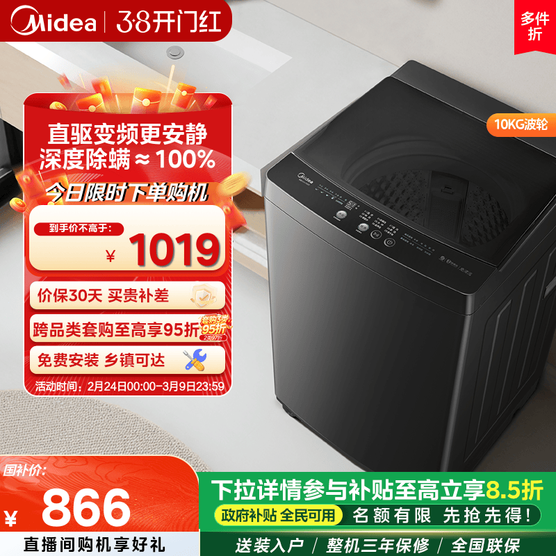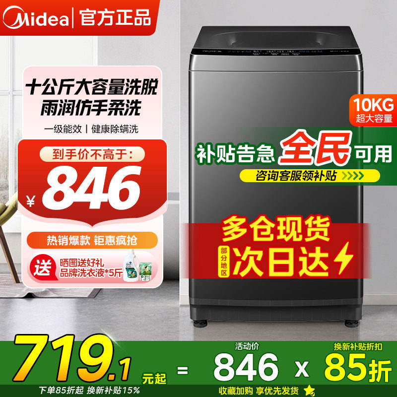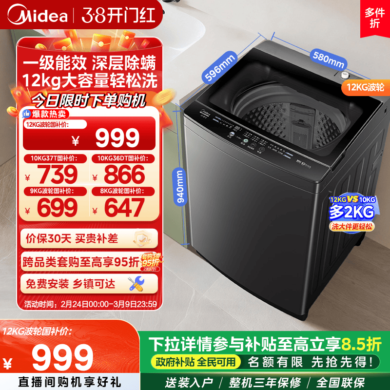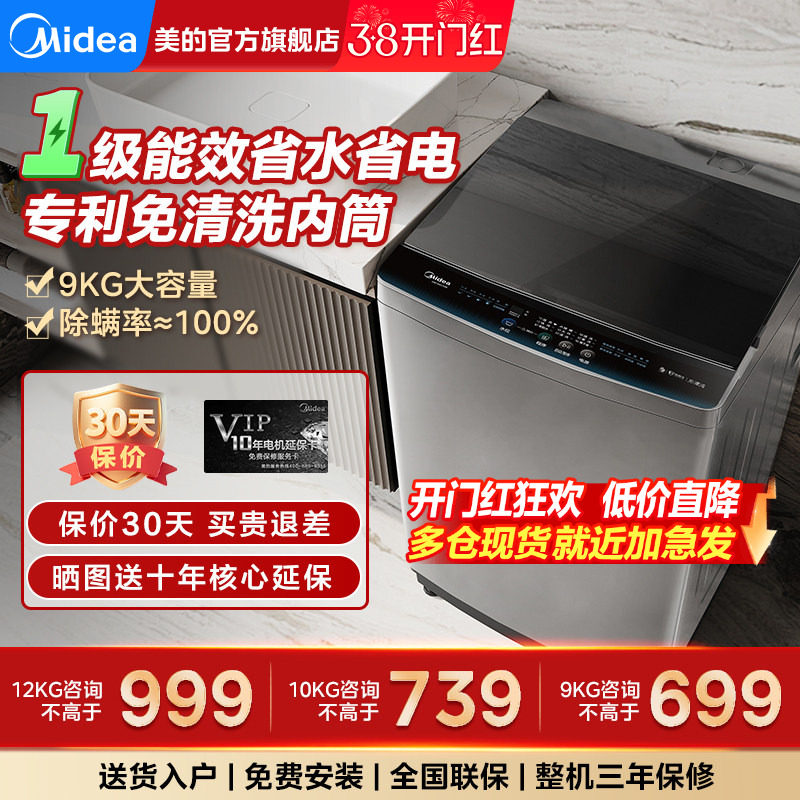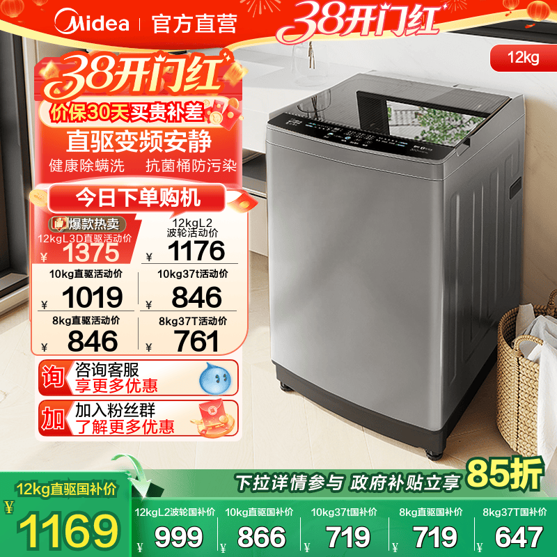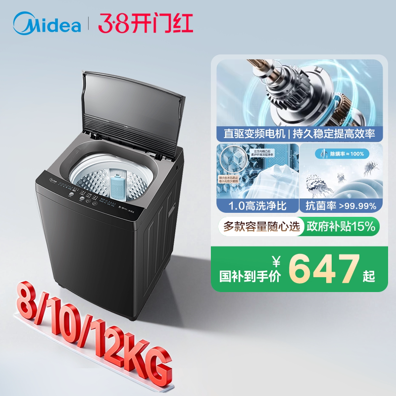[全民补贴]美的直驱变频12/10/8kg全自动家用大容量波轮洗衣机