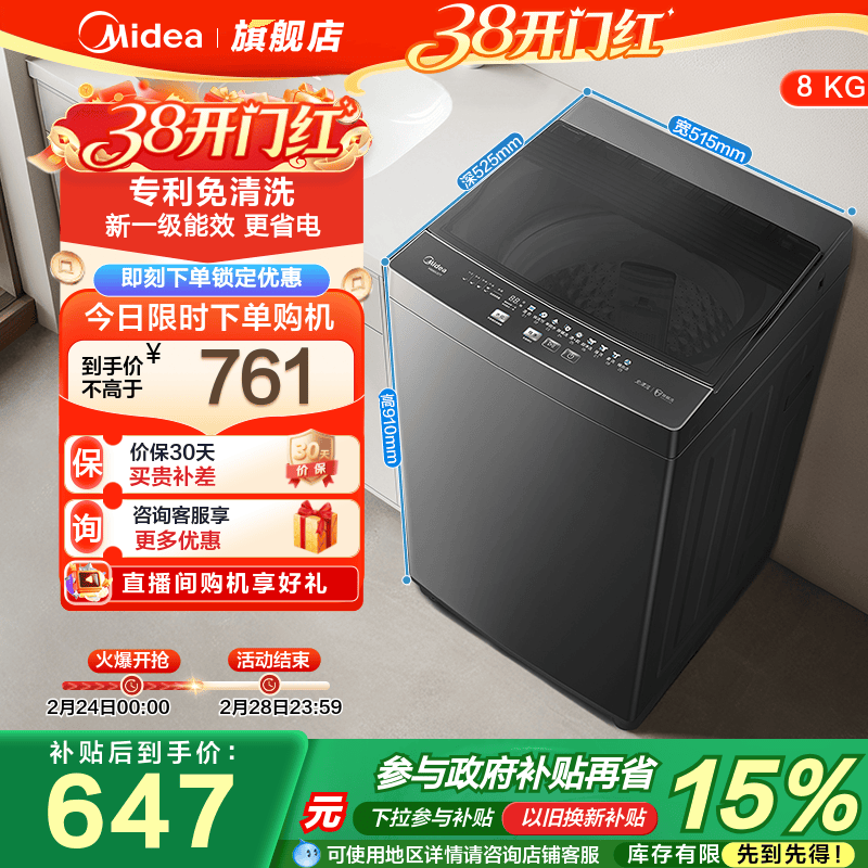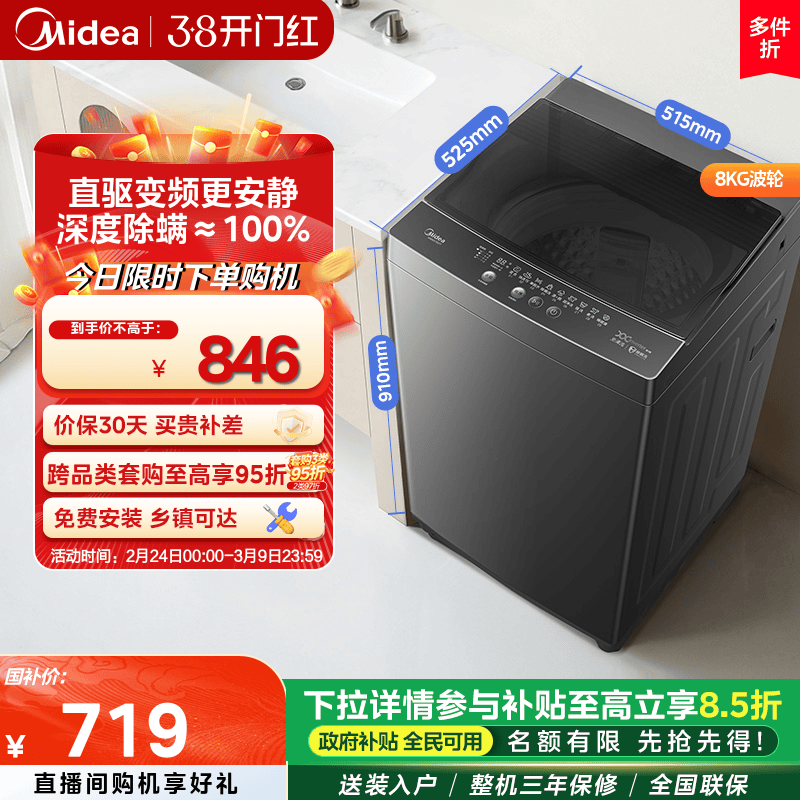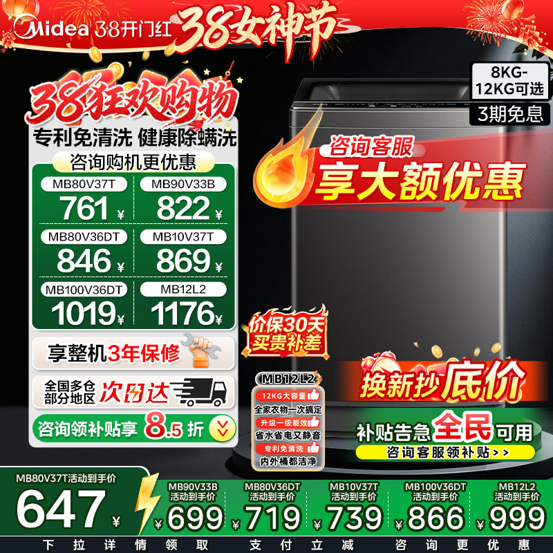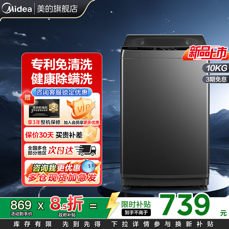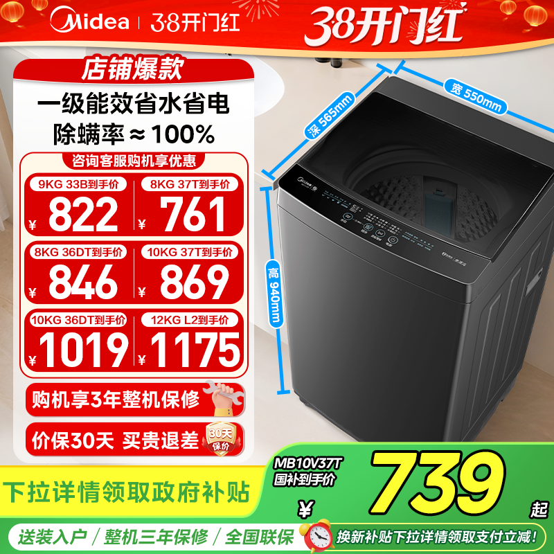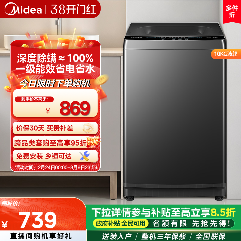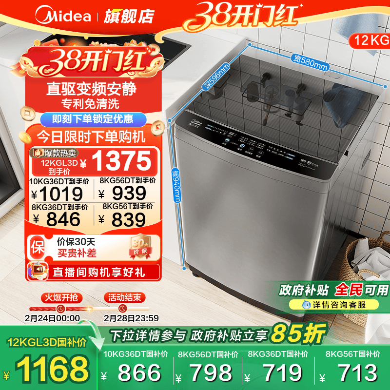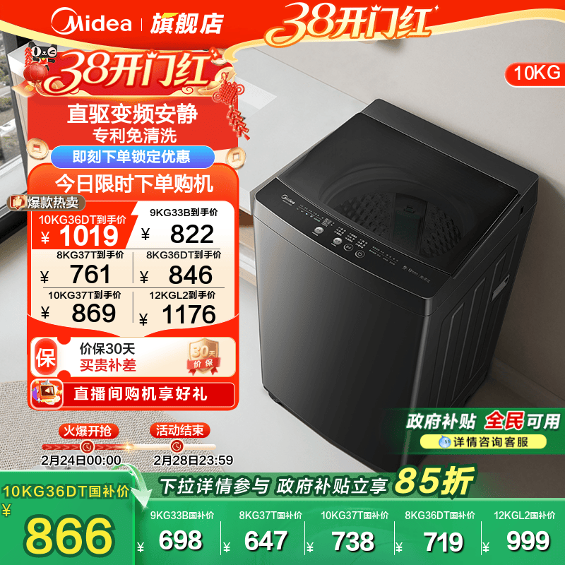 [全民补贴]美的直驱变频12/10/8kg全自动家用大容量波轮洗衣机