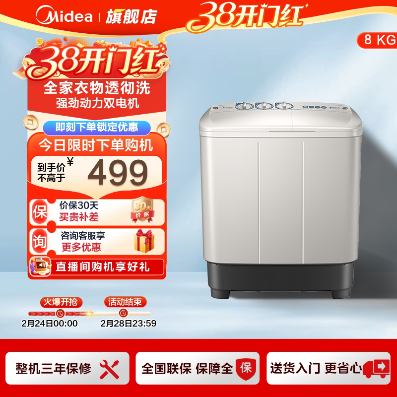 [以旧换新补贴]美的8kg大容量半自动家用租房双桶双缸波轮洗衣机