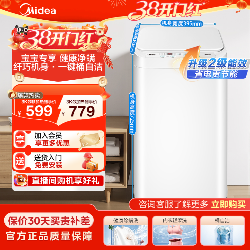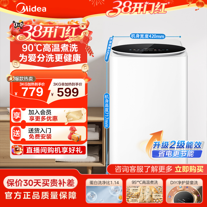 美的3kg婴儿宝宝迷你小型高温煮洗杀菌除螨全自动家用波轮洗衣机