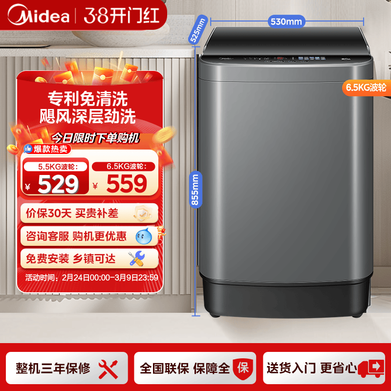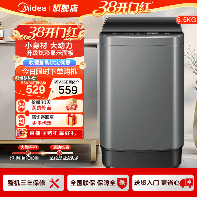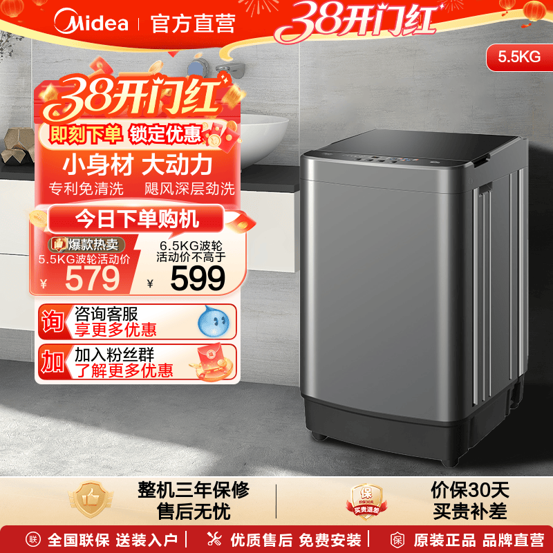 以旧换新补贴美的5.5/6.5kg洗衣机全自动小型租房洗脱一体波轮36E