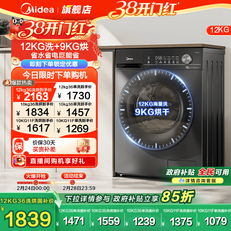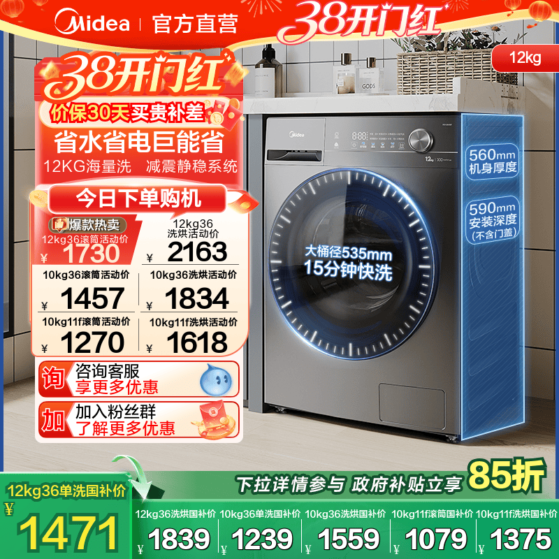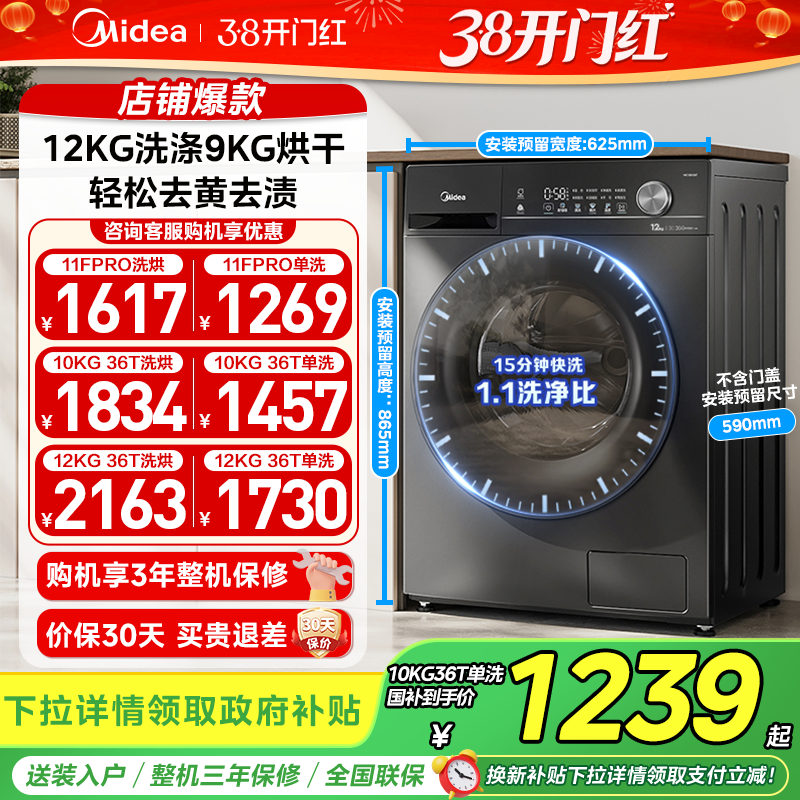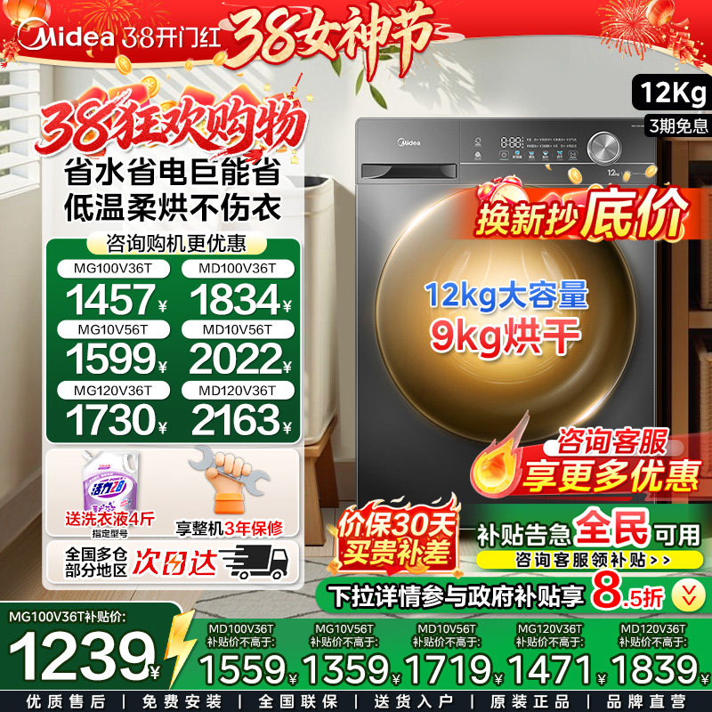 全民补贴美的10/12kg滚筒洗衣机洗烘一体全自动大容量变频除菌36