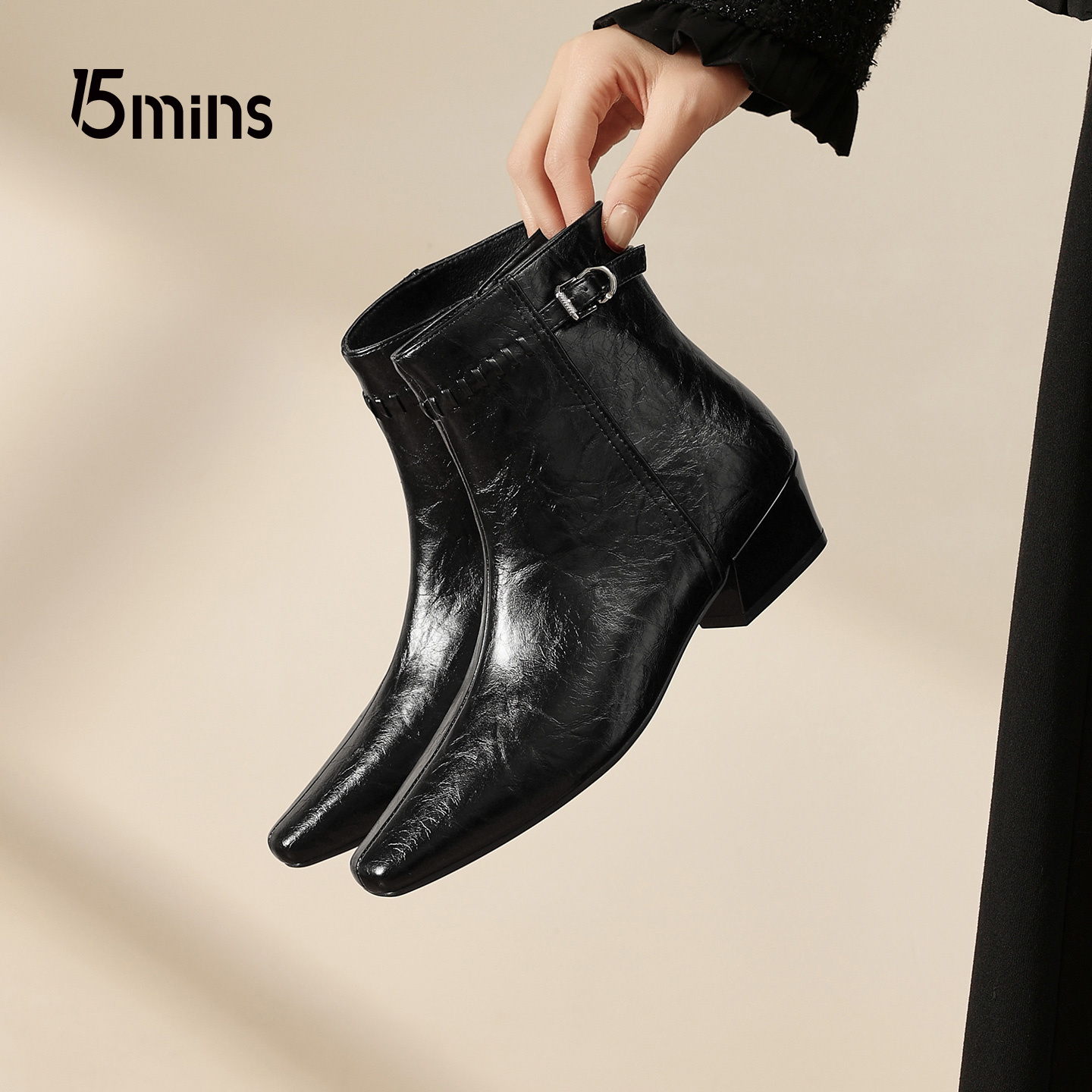 15mins粗跟摩卡短靴女2025冬季新款法式高级感气质小皮靴加绒女靴