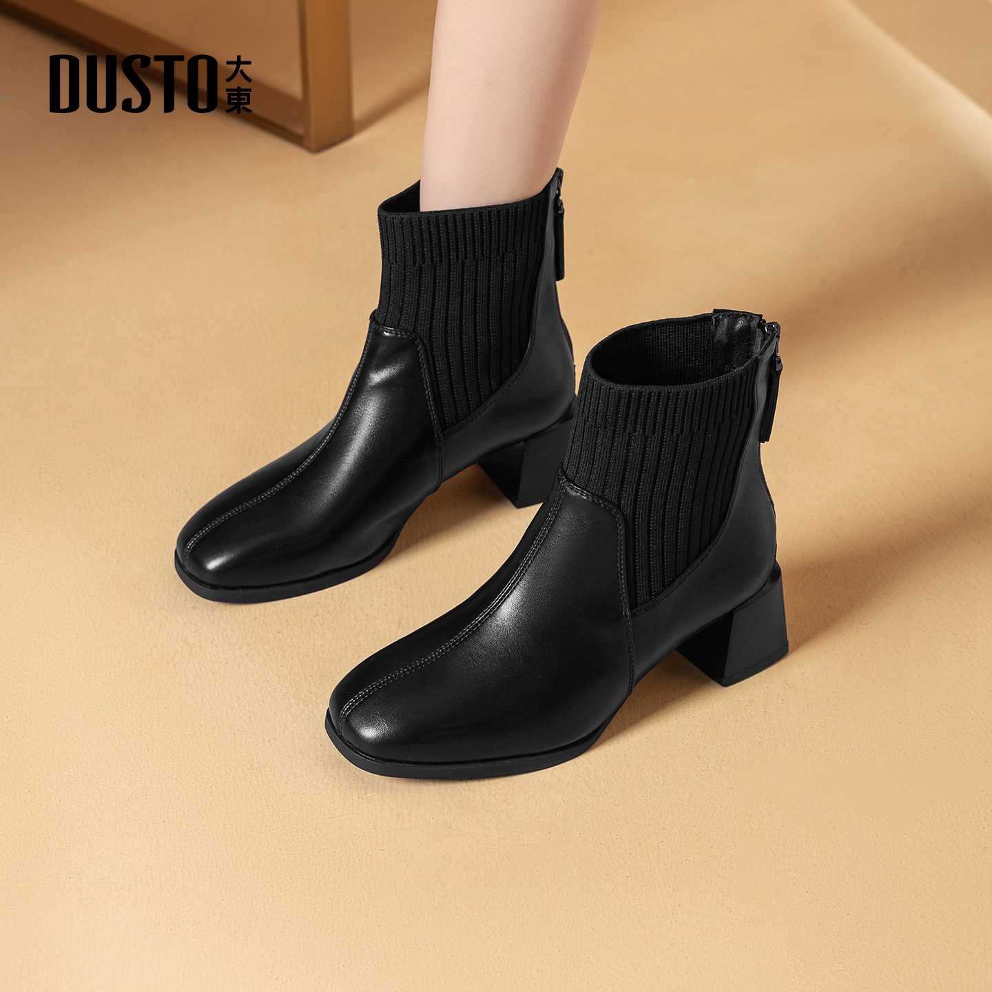 大东女靴时装靴2025冬季新款加绒保暖短靴粗跟方头职场通勤袜靴