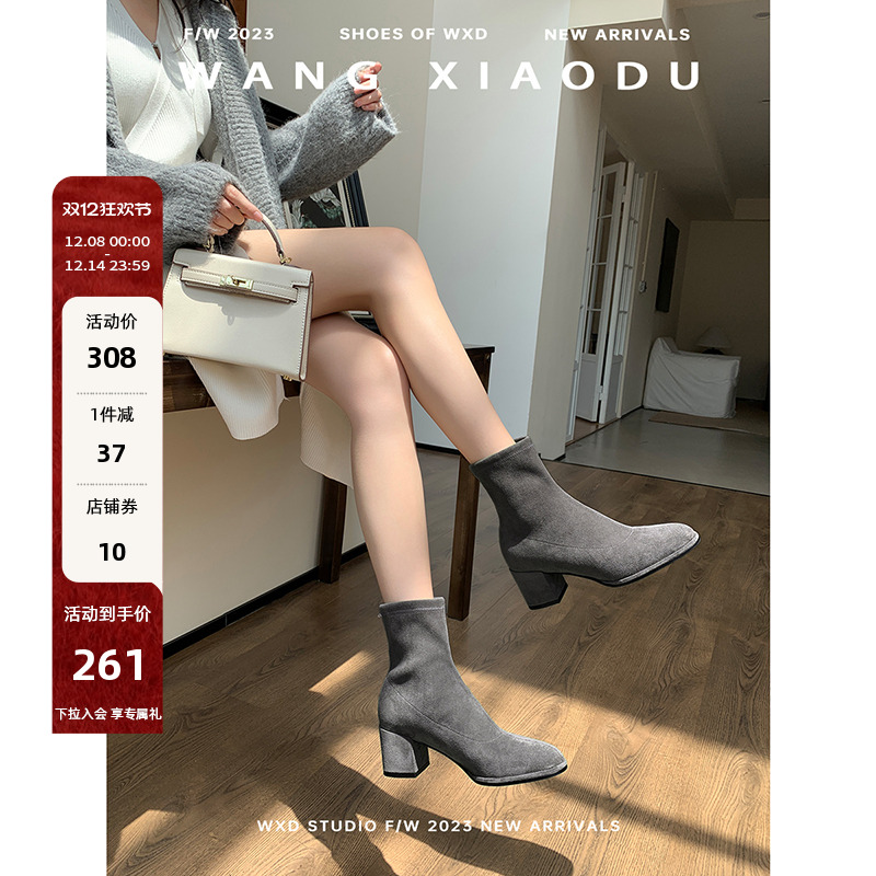 【王小毒】Z时代●真皮及裸袜靴短靴女粗高跟新款方头加绒瘦瘦靴
