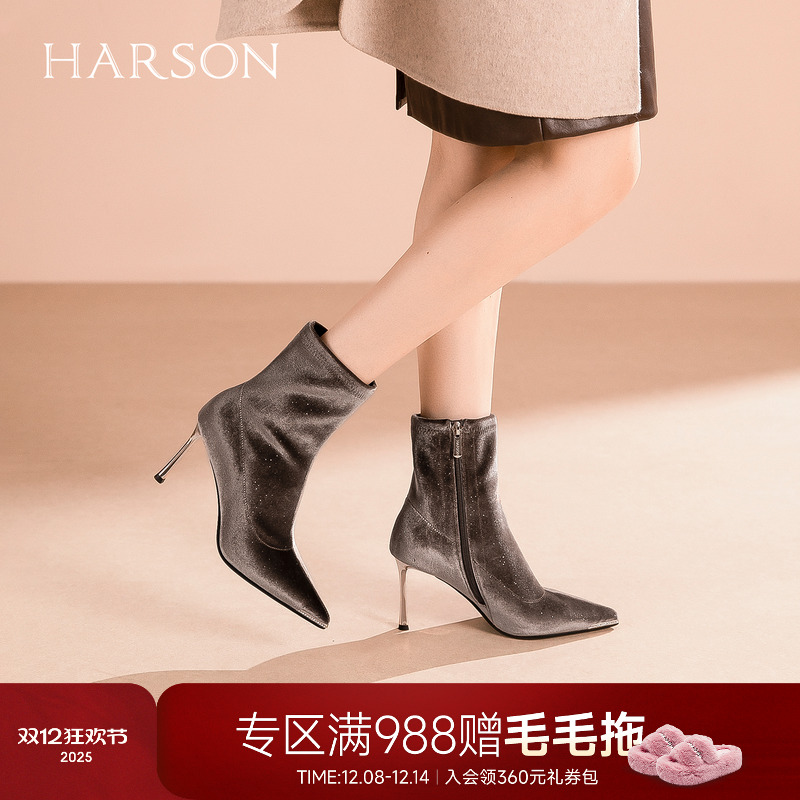 哈森气质时装靴女2025秋冬新款百搭侧拉链细高跟鞋HA257109