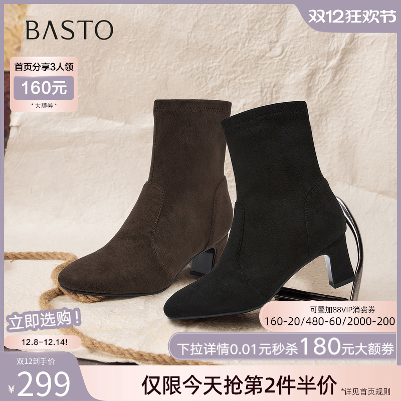 百思图2025冬季新款通勤粗跟绒面粗跟弹力靴瘦瘦靴女短靴K5089DZ5