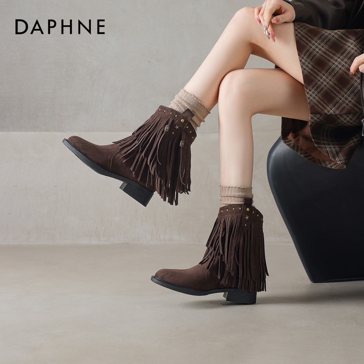 达芙妮美拉德靴子女2025新款秋冬季加绒棕色流苏短靴骑士靴马丁靴