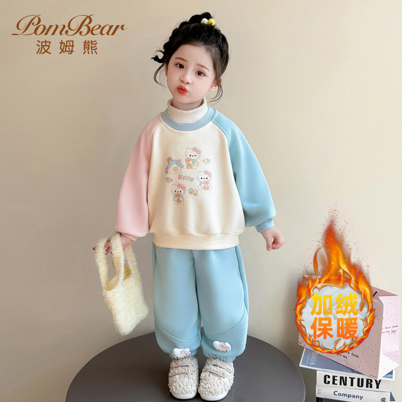 波姆熊女童卫衣套装加绒休闲可爱秋冬新款保暖卡通儿童衣服两件套