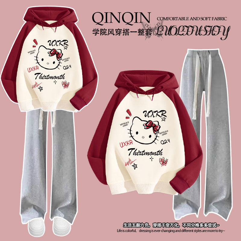 2026秋冬季女童新款洋气卡通印花潮加绒插肩连帽卫衣长裤两件套装
