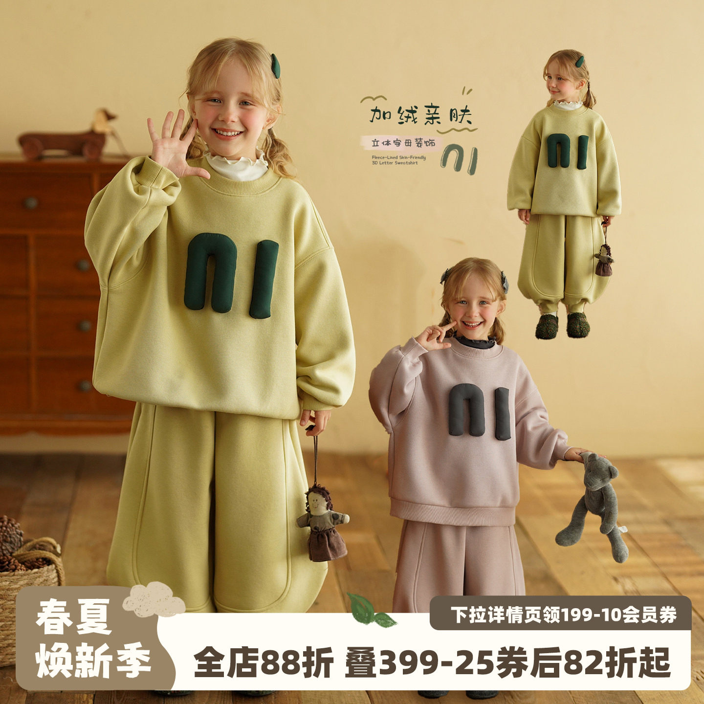 砚台家童装女童一体绒卫衣套装2025冬新款儿童加绒加厚卫裤两件套