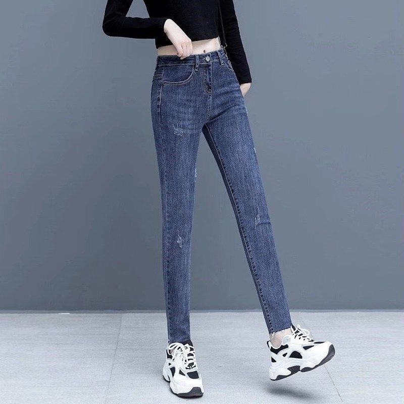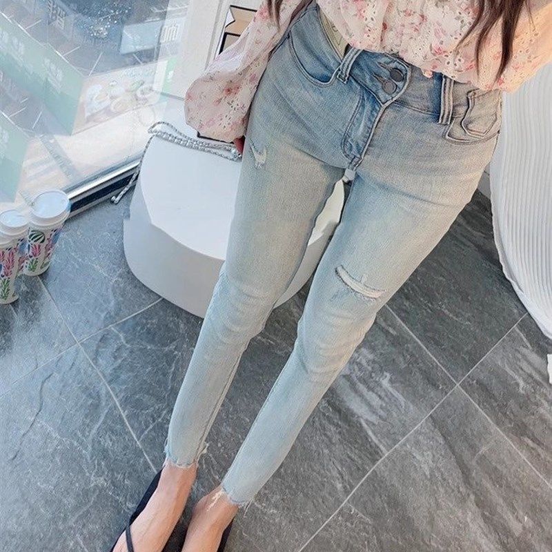 - 高腰弹力牛仔裤女破洞