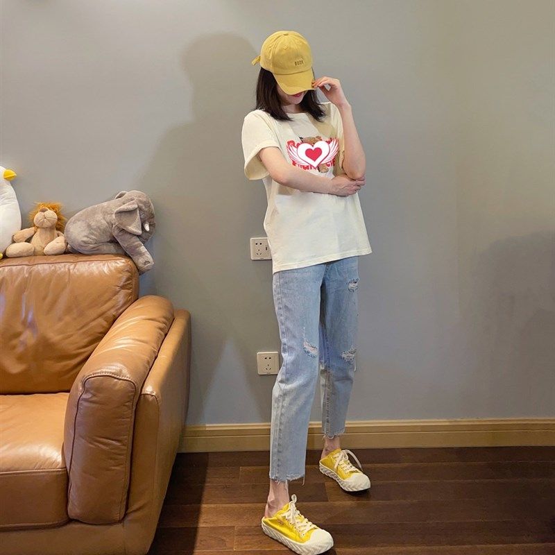 - 直筒破洞牛仔裤女九分