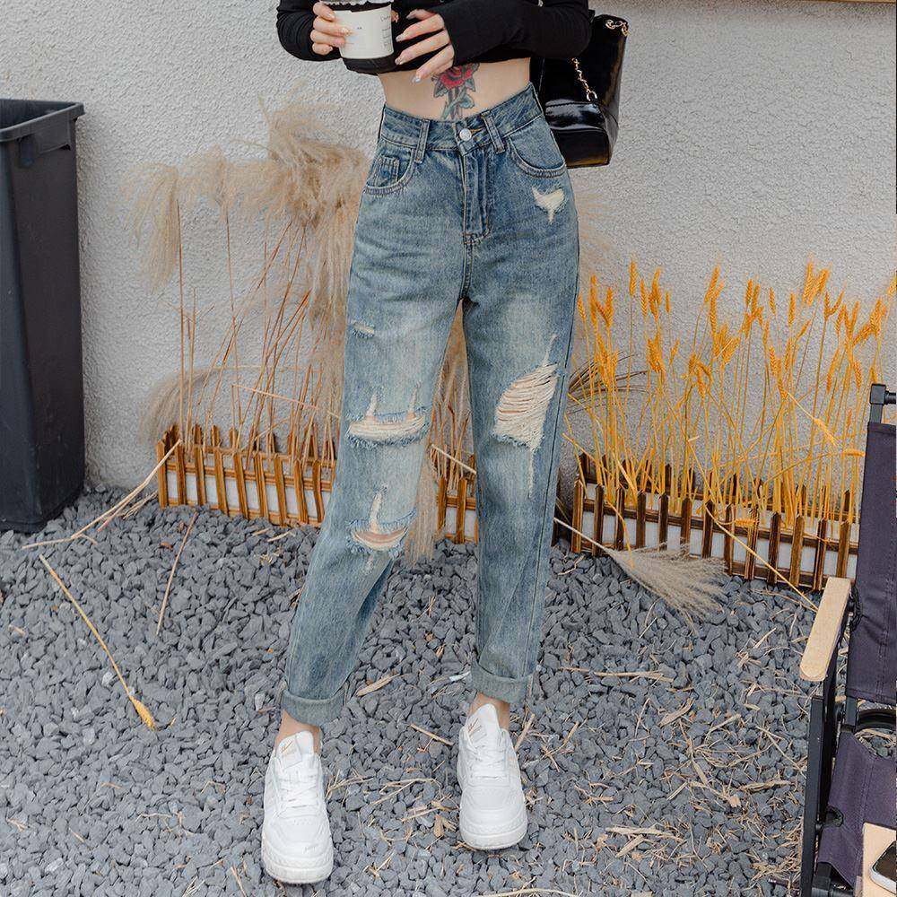 - 大破洞牛仔裤 女 高腰