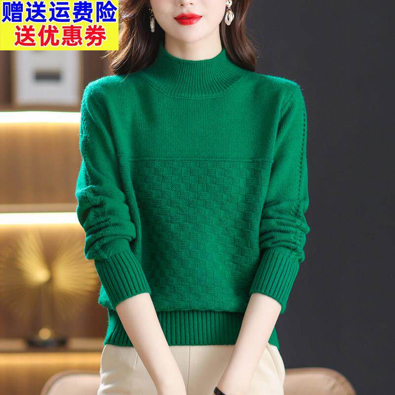 绿色半高领套头打底毛衣女短款2022秋冬新款宽松内搭洋气厚针织衫