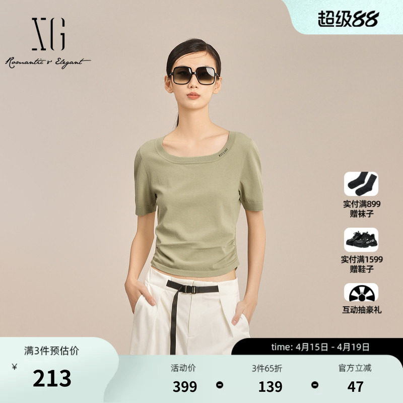 XG雪歌短款方领短袖毛针织衫2025夏季新款浅绿色通勤套头毛衫女装