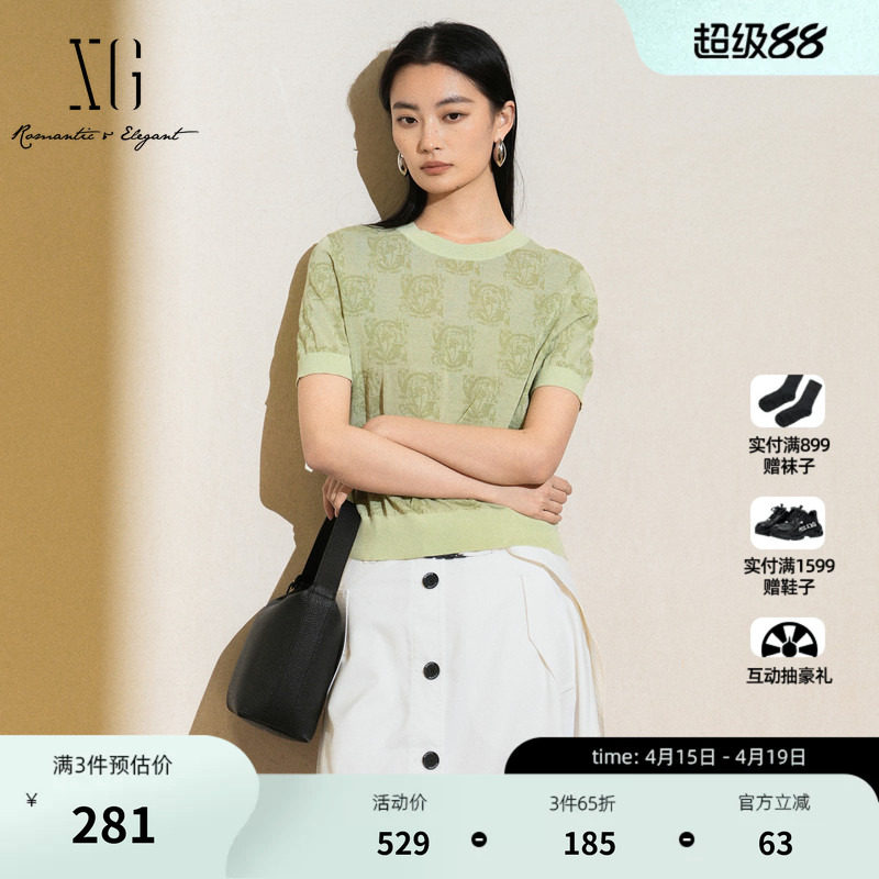 XG雪歌通勤简约短袖毛针织衫2025夏季新款浅绿色短款套头毛衫女装