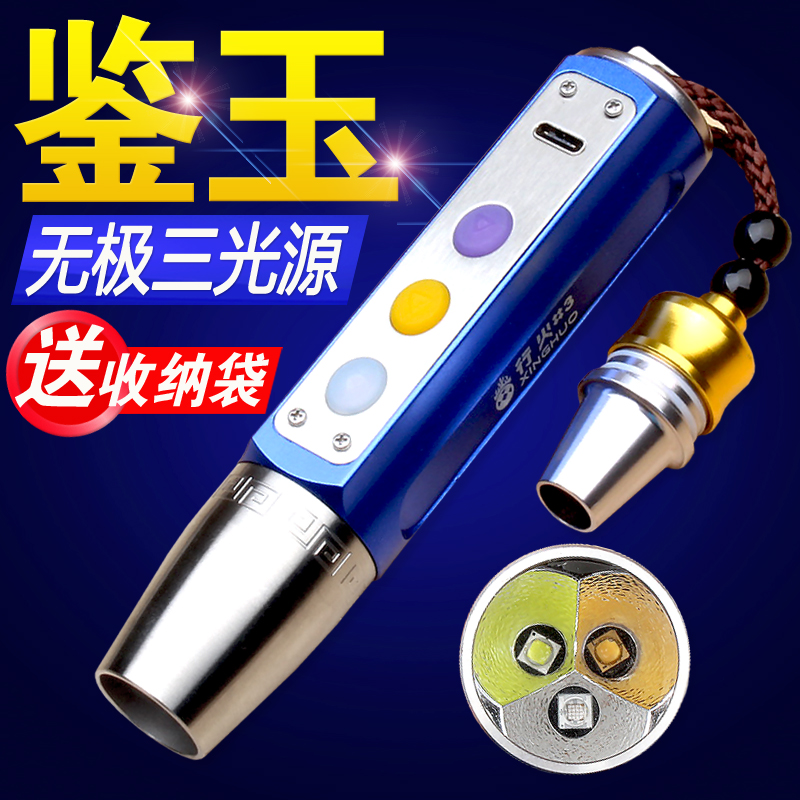 三光源珠宝玉石鉴定强光手电筒翡翠紫光验钞灯荧光剂检测笔可充电