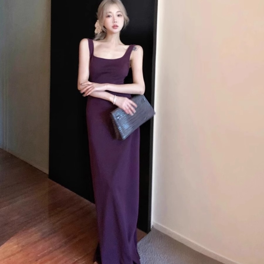 高级感紫色气质方领连衣裙夏季女装极简修身显瘦无袖低领吊带长裙