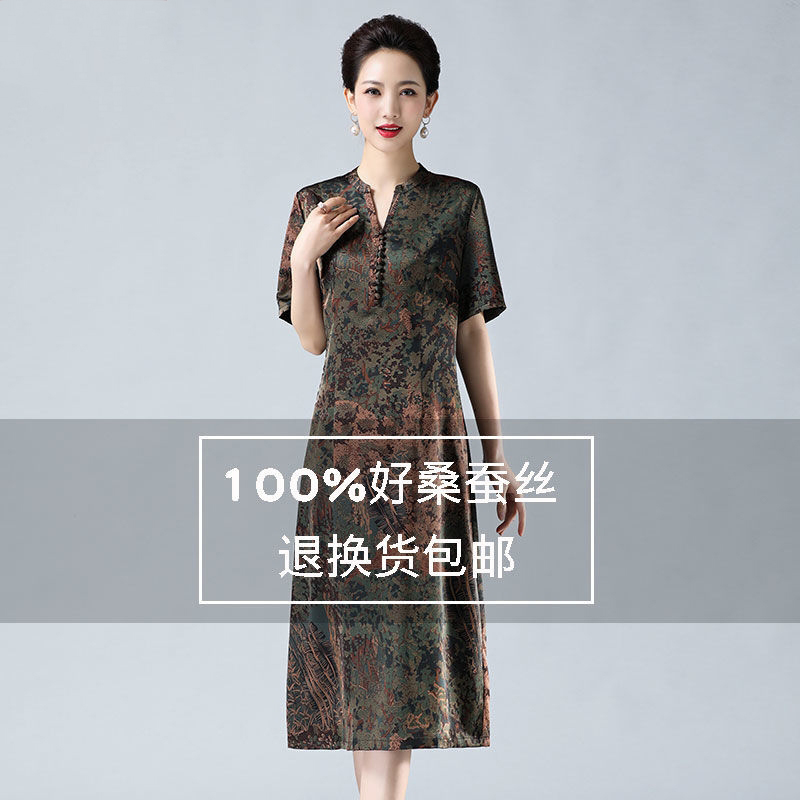 桑蚕丝中老年宽松过膝连衣裙夏季女装2024新款真丝长裙大码妈妈装