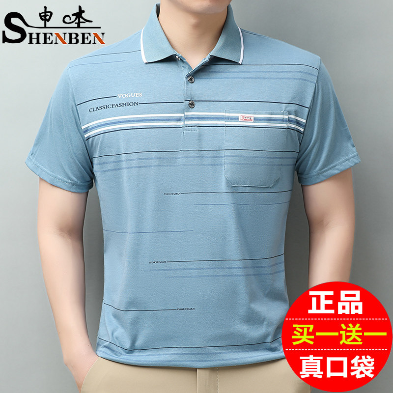 申本新品夏装男款T恤短袖条纹洋气丝光棉半袖中年帅气翻领polo衫