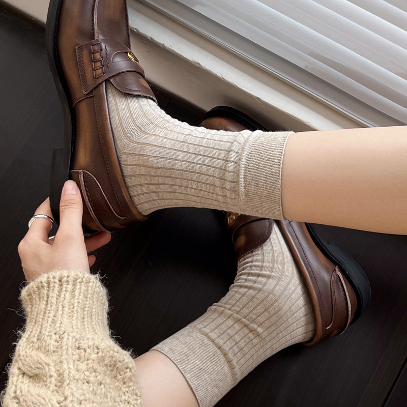 秋冬款米白色小腿袜女棉短袜竖条纹咖啡色堆堆袜百搭灰色中筒袜子
