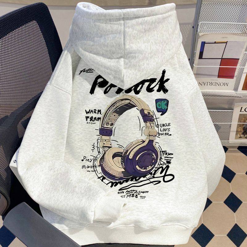 男童美式潮牌耳机印花连帽卫衣男孩秋冬新款宽松街头高街外套帽衫