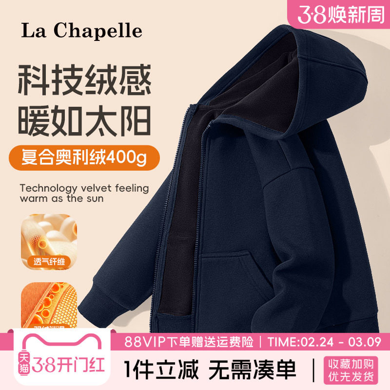 拉夏贝尔男童薄绒外套儿童一体绒秋冬款加厚连帽卫衣男孩加绒开衫