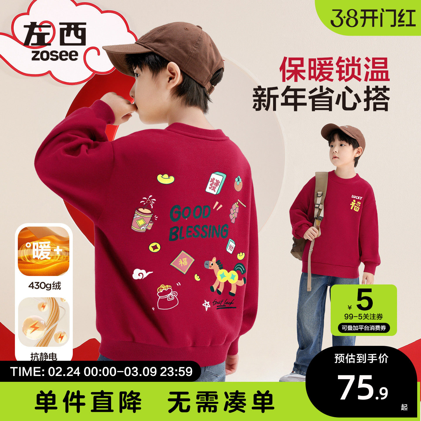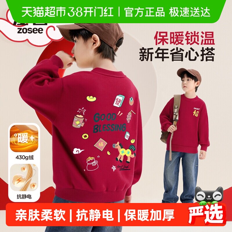 左西童装男童红色加绒卫衣2026秋冬新款马年本命年保暖加厚冬外套