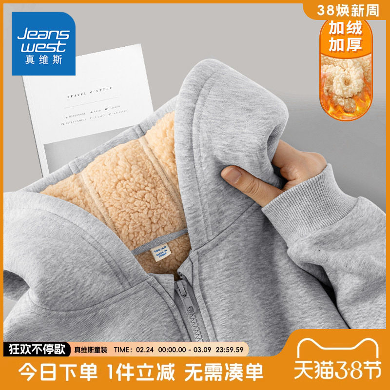 真维斯童装男童外套秋冬款儿童羊羔绒连帽卫衣开衫男孩加绒上衣秋