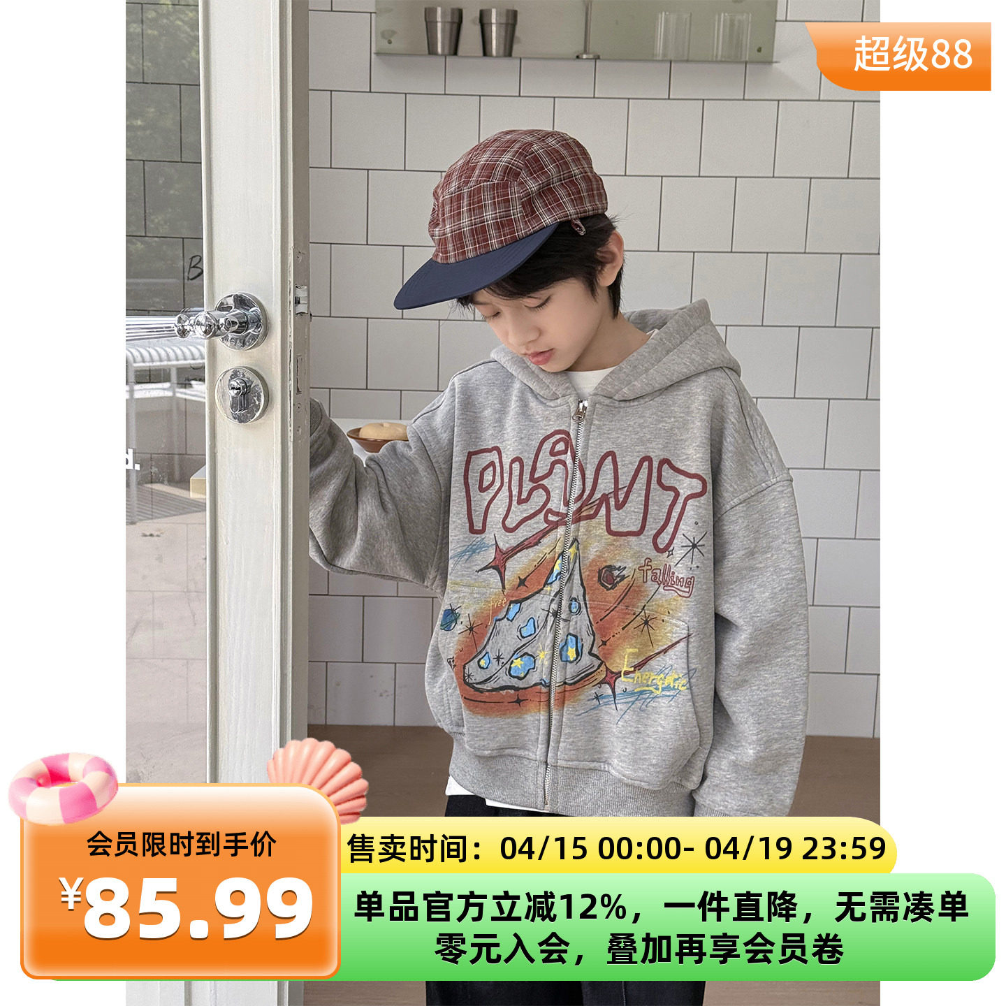 HM童装儿童男童卫衣夏季新款加绒宽松拉链连帽衫外套1280294