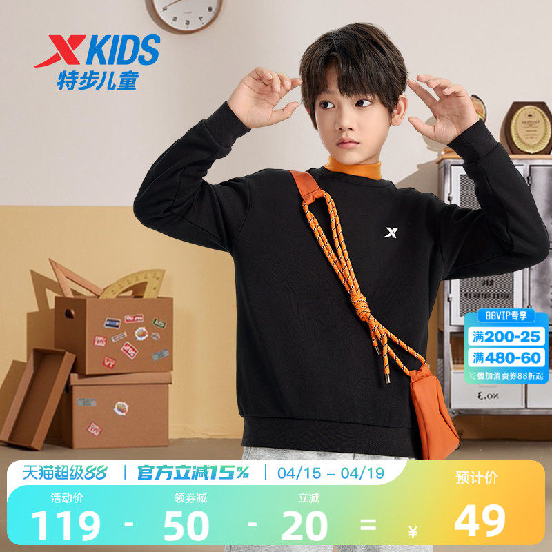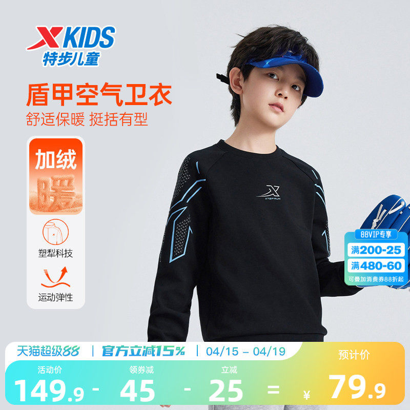 盾甲|特步童装春季新款儿童运动男童中大童柔软亲肤加绒套头卫衣