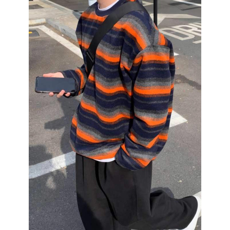 大码300斤橙色条纹圆领撞色卫衣男春秋日系原宿风穿搭宽松长袖T恤