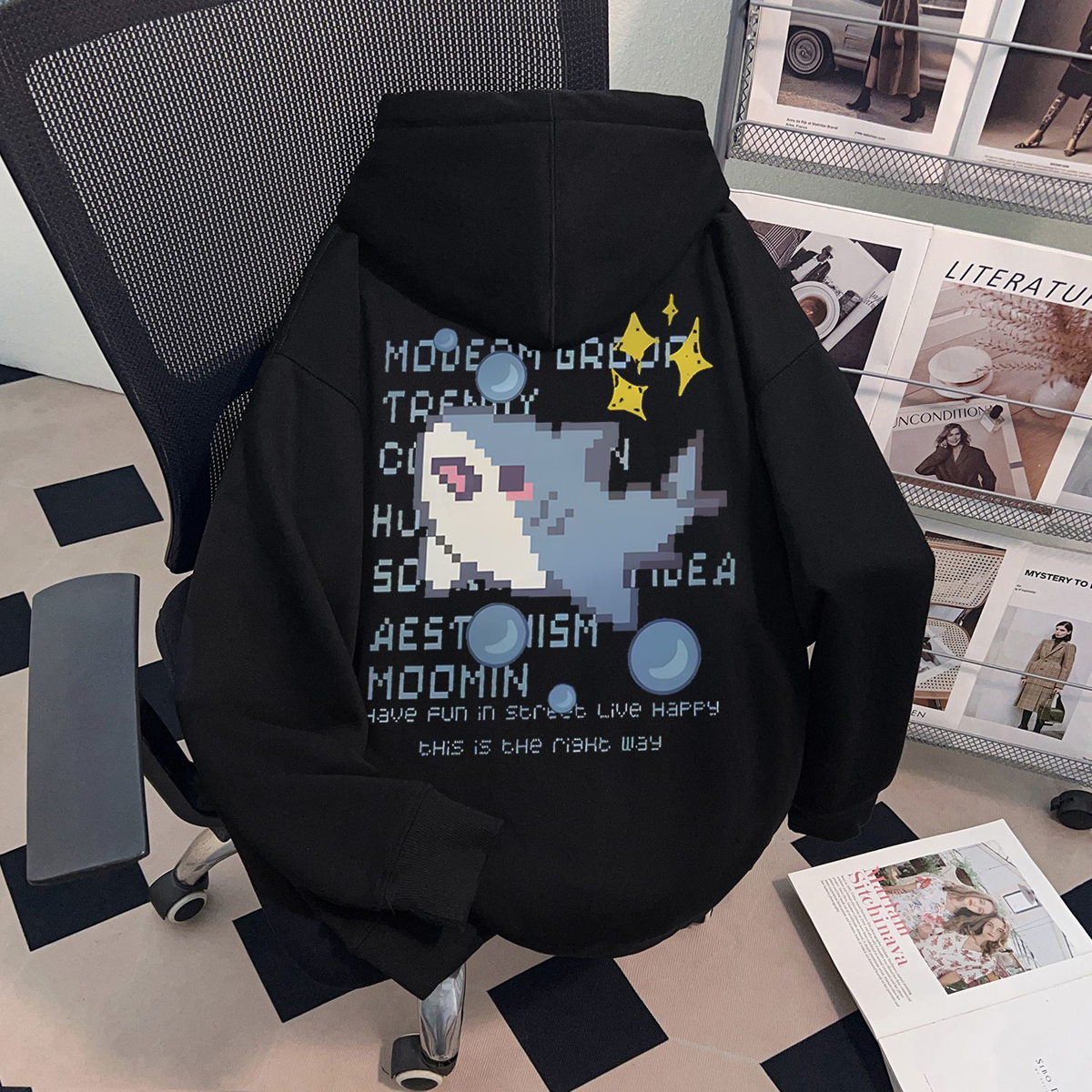 银狐绒韩版猫咪印花连帽卫衣男秋冬季宽松百搭休闲学院风上衣外套