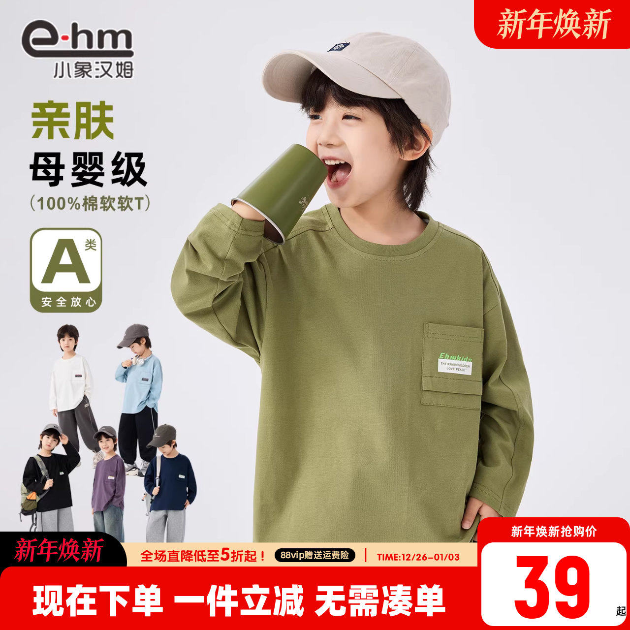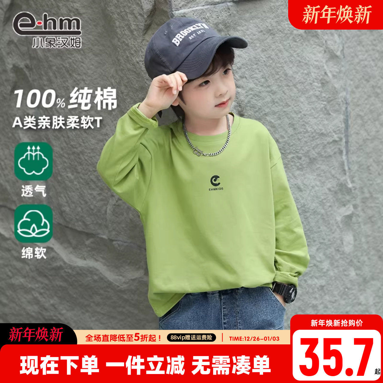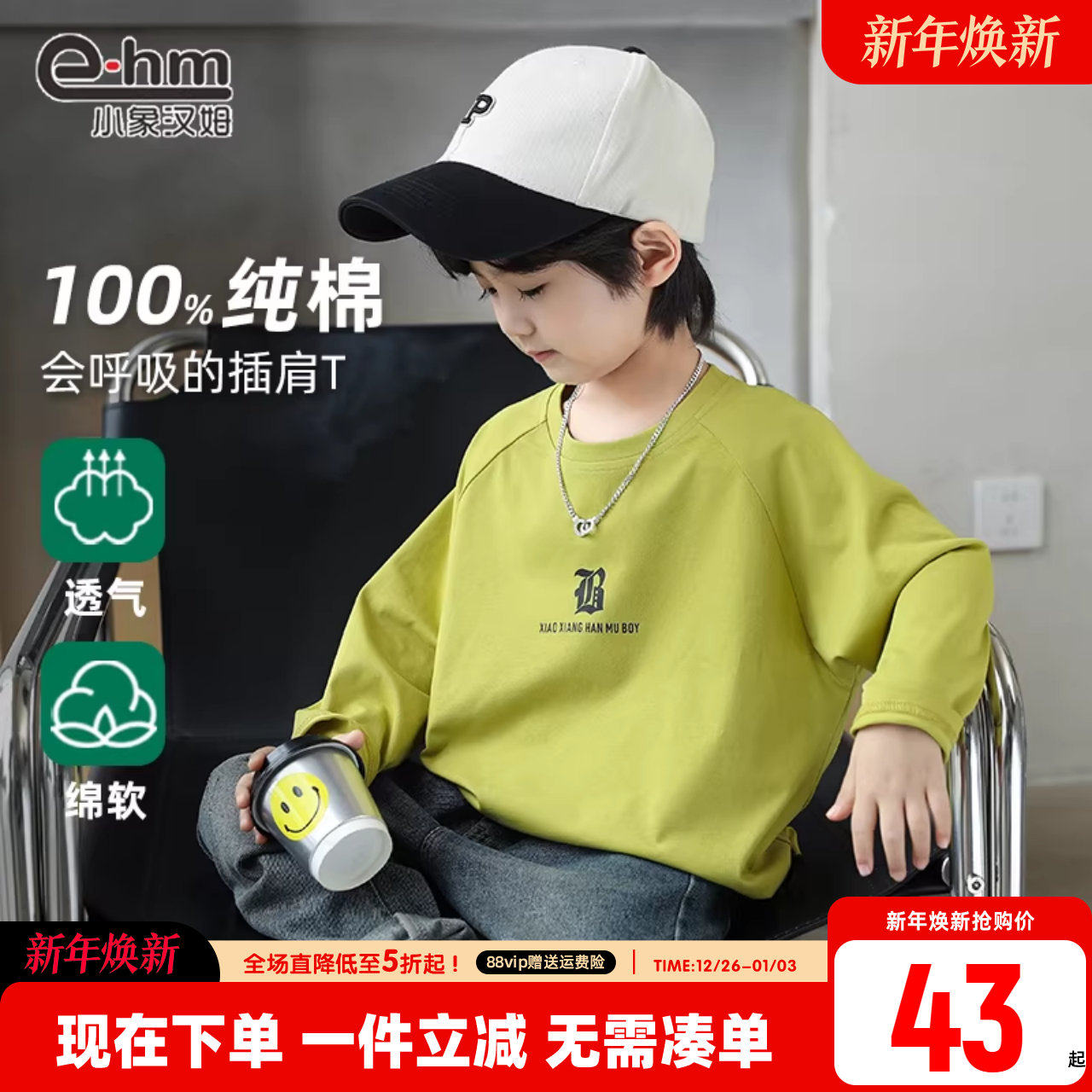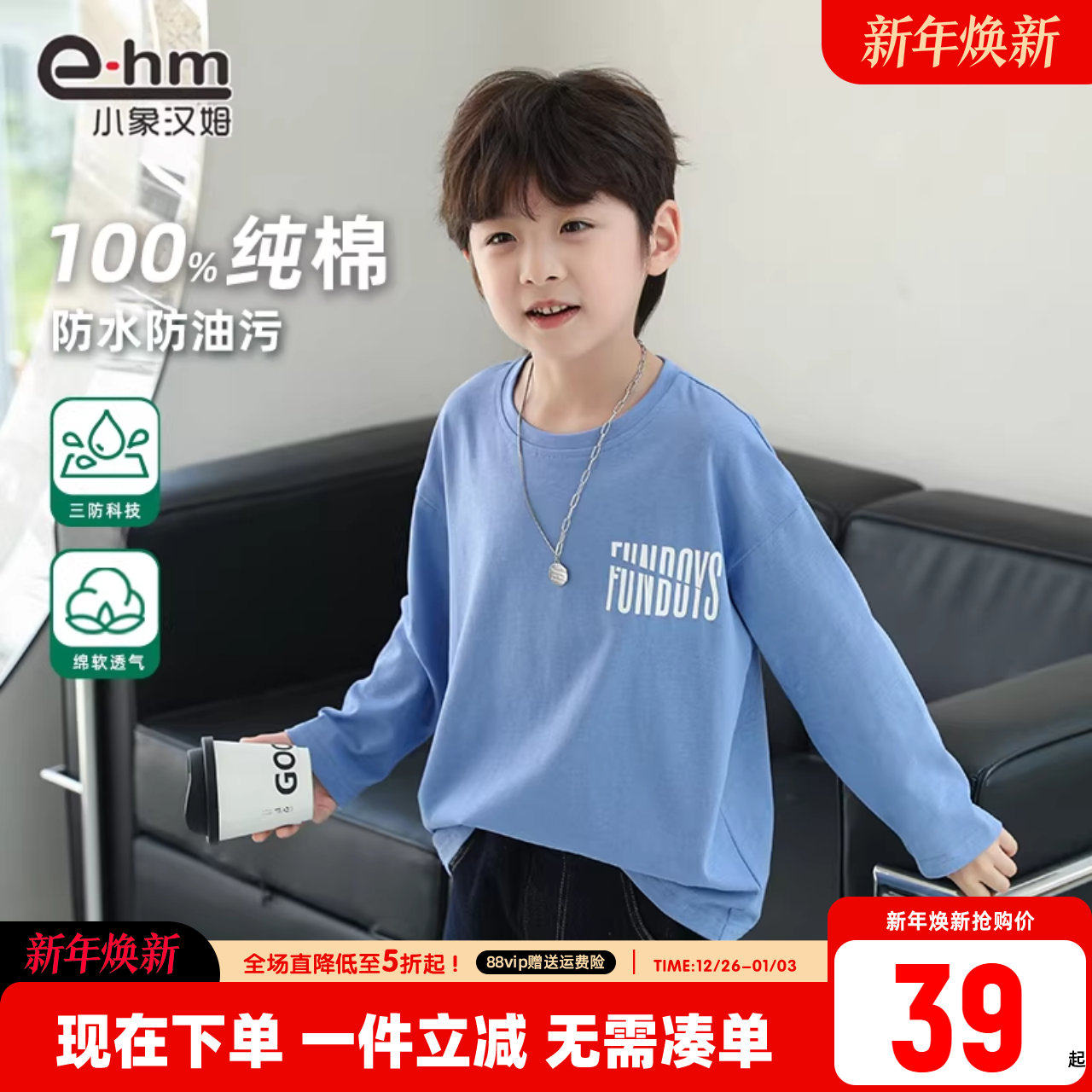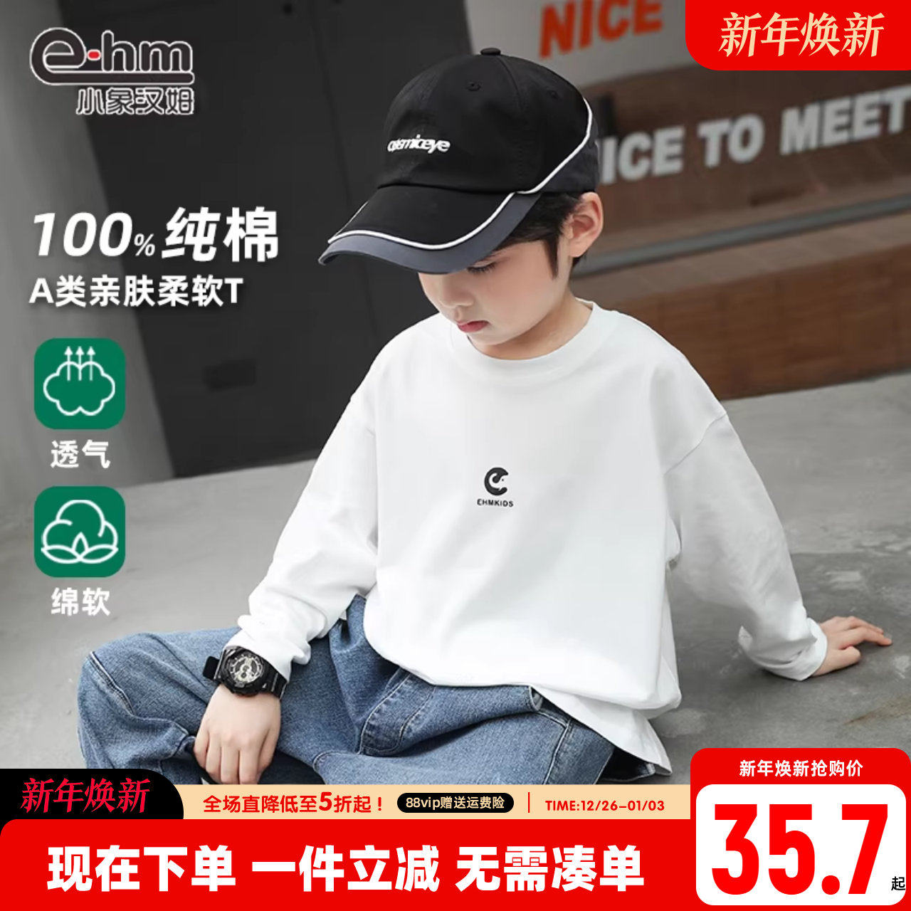 小象汉姆童装男童长袖t恤纯棉儿童打底衫白色体恤衫2025秋装新款