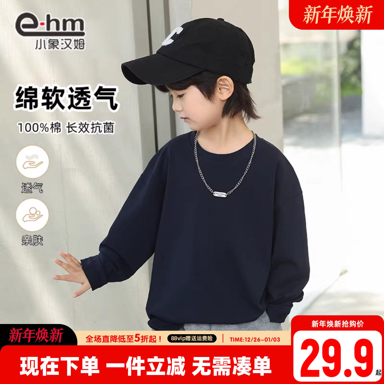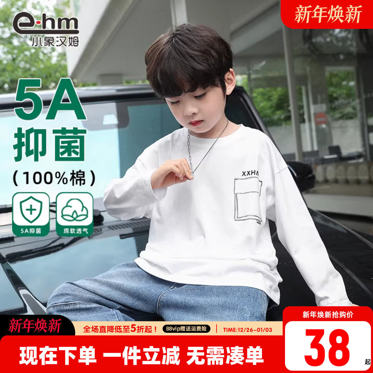小象汉姆童装男童长袖T恤儿童白色打底衫纯棉2025秋装新款5A抗菌
