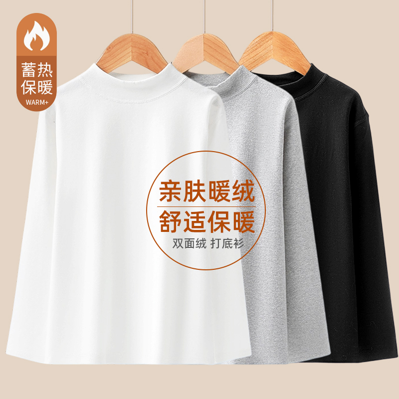 儿童加绒白色打底衫德绒男童内搭长袖T恤圆领女童保暖秋衣单上衣