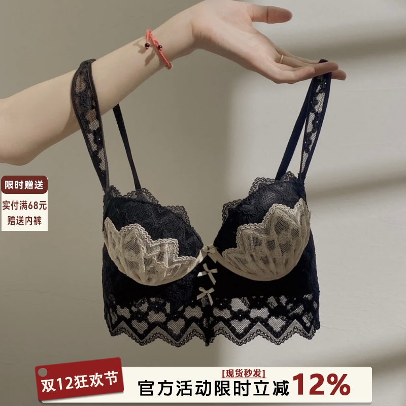 复古名媛 性感蕾丝加长文胸套装无钢圈上薄下厚聚拢小胸内衣奶罩