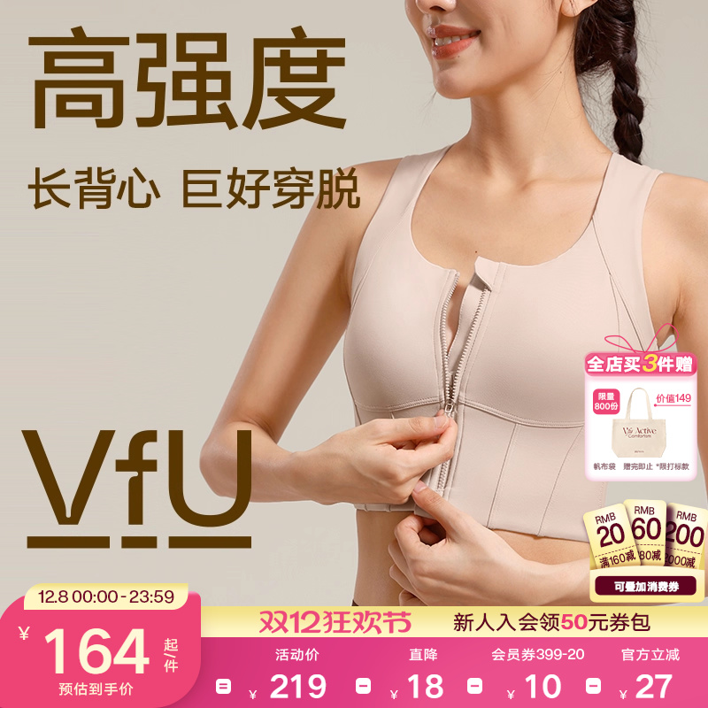 VfU前拉链高强度运动内衣女收副乳长款外穿背心跑步健身训练文胸