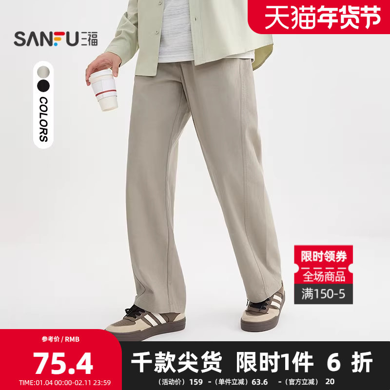 三福2025秋冬新款休闲裤男纯色棉麻宽松直筒橡筋腰长裤裤子506268