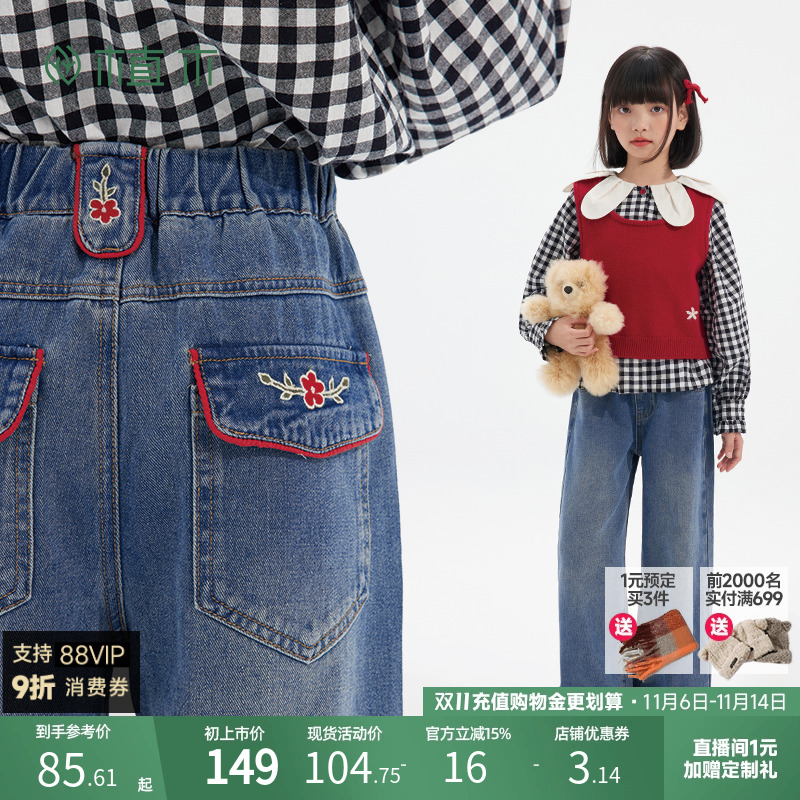 植木童装女童裤子2025秋冬新款中大童直筒阔腿裤牛仔裤儿童裤子