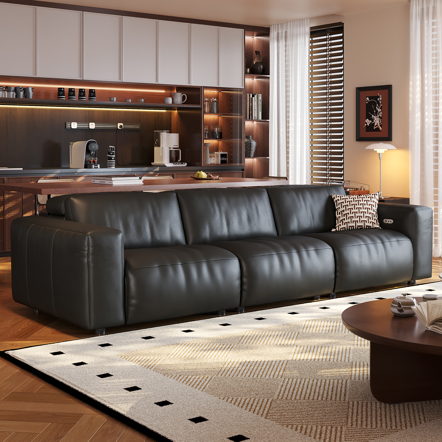 云朵真皮沙发现代头层牛皮客厅中古风新款多功能三人直排沙发黑色