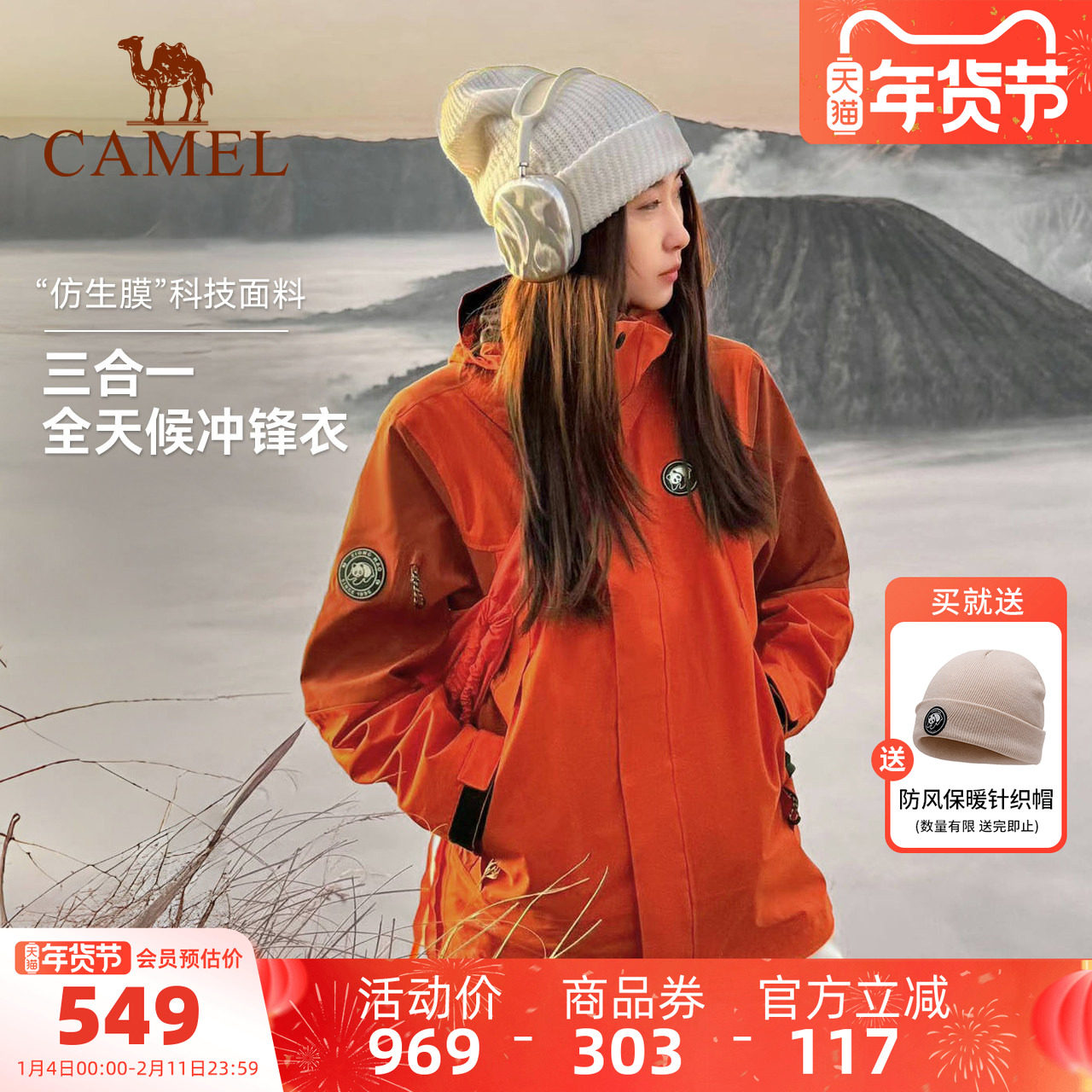 骆驼熊猫户外橙色冲锋衣女款三合一新款加厚防风登山服好看外套男