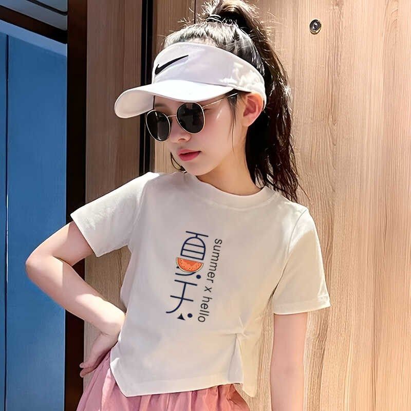白色短袖T恤男童夏季新款2024C年辣妹女童不对称设计亲子上衣小衫