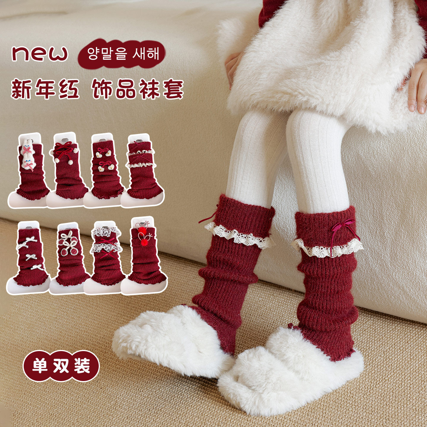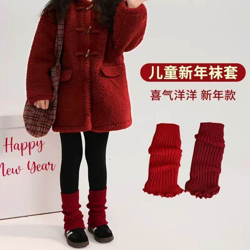 儿童袜套秋冬季大红色新年袜套女童保暖小腿套韩版花边宝宝堆堆袜