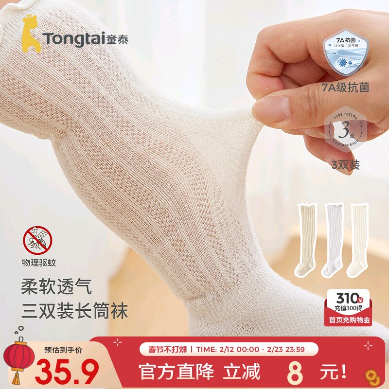 童泰婴儿长筒袜男女宝宝袜子儿童花边无骨宽口袜抗菌高筒袜3双装