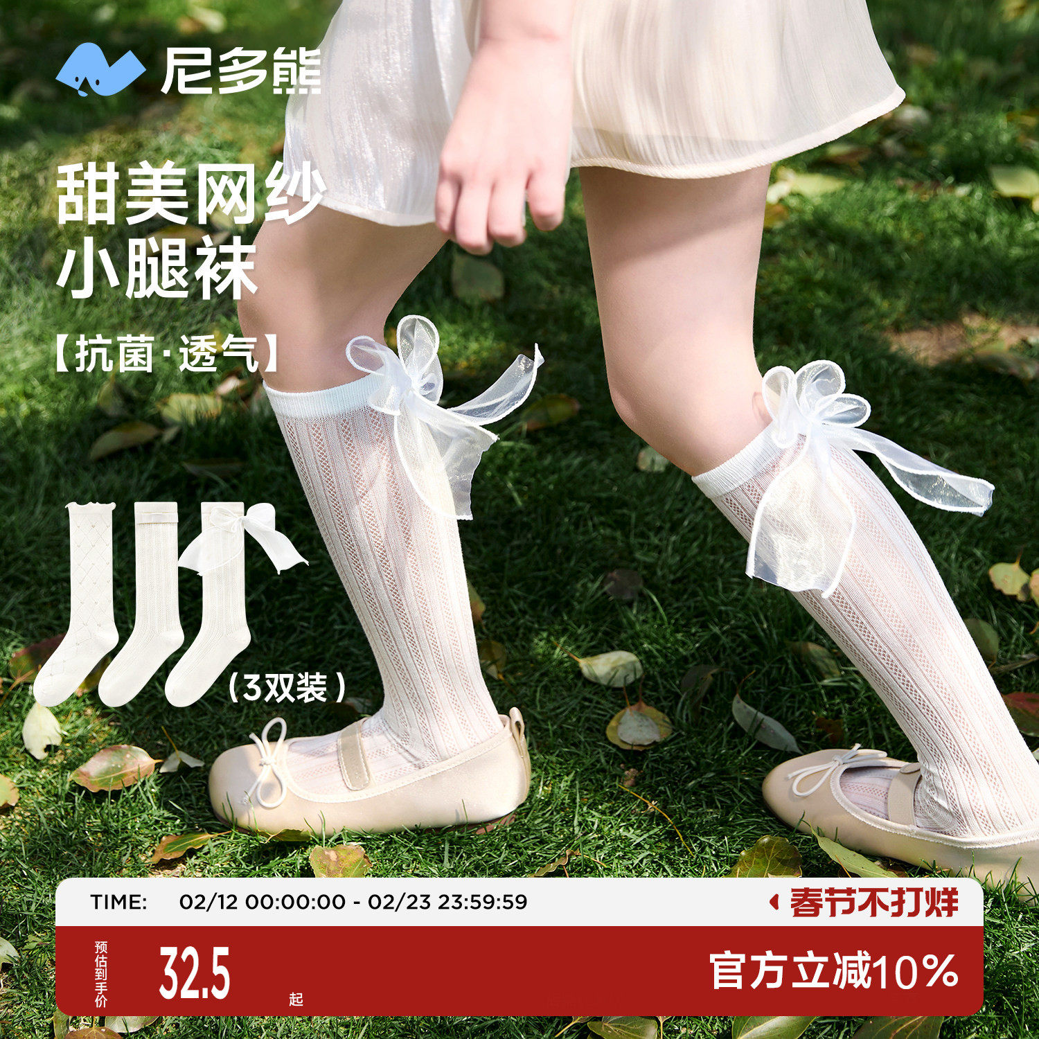 尼多熊儿童长筒花边袜春夏薄款棉袜女童公主袜蕾丝蝴蝶结中筒不勒