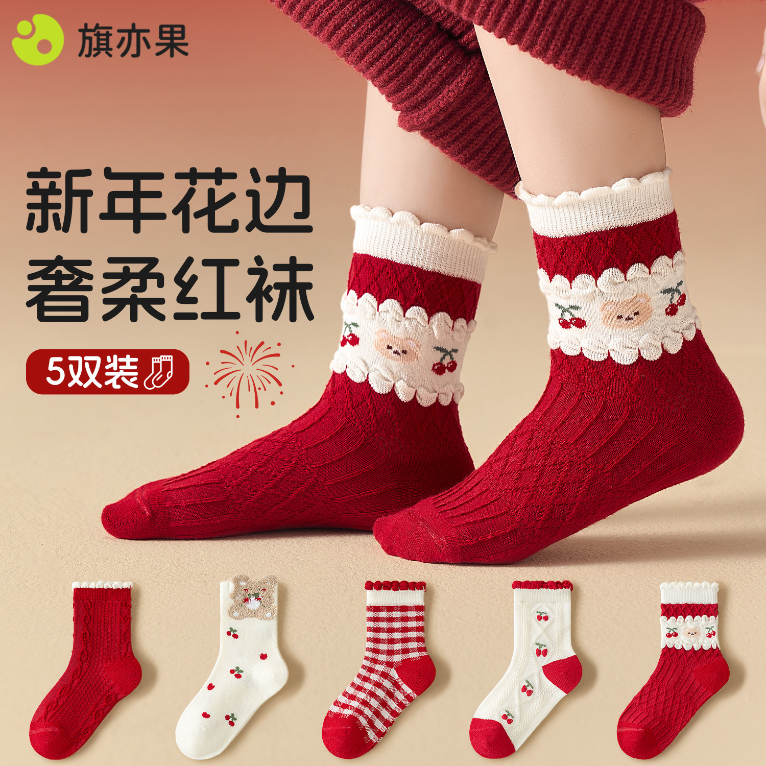 冬季女童袜子秋冬款棉袜儿童新年袜女孩冬款花边童袜中筒红色袜子