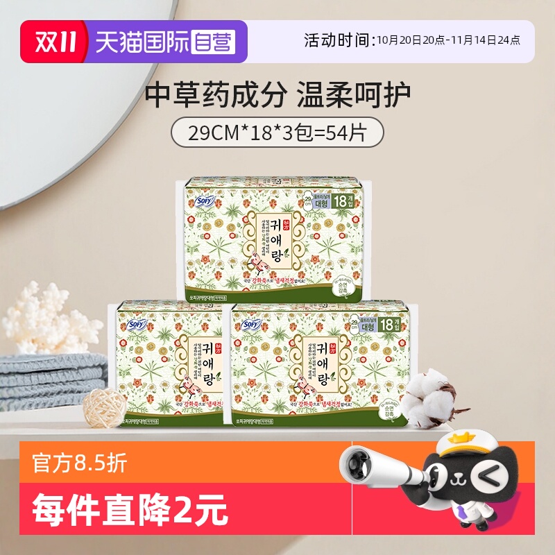 【自营】韩国贵艾朗舒柔贴身加长日用29cm*3包中草药卫生巾姨妈巾