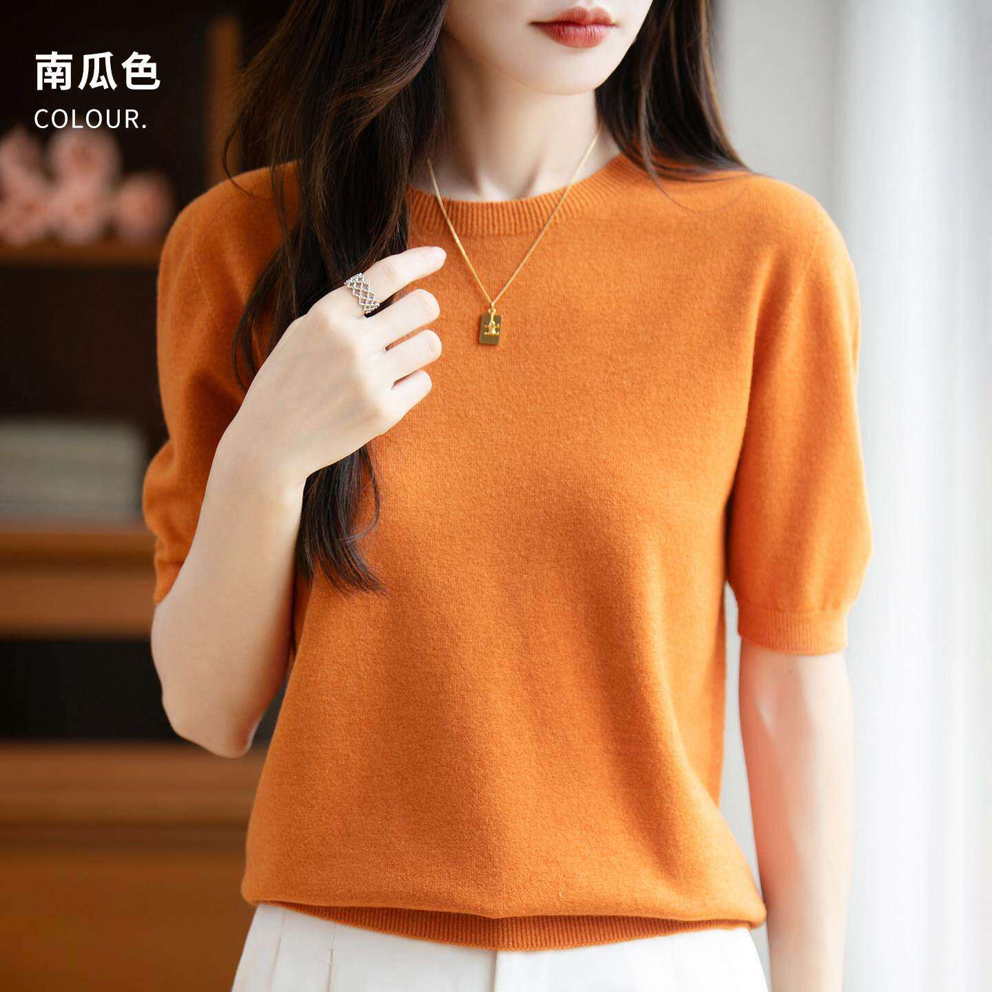 春夏圆领短袖女羊绒衫宽松套头短款打底衫半袖针织衫薄款中袖毛衣